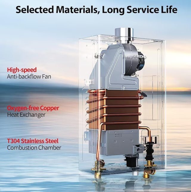 The Mizudo indoor tankless water heater is a compact, efficient solution for small homes, apartments, and cabins, delivering 3.6 GPM of continuous hot water with 80,000 BTU. Its sleek design includes a touch panel LED display, supports simultaneous water supply for 2 to 3 water points, and precise temperature control. The heater features an oxygen-free copper heat exchanger for durability, and a high-speed anti-backflow fan. With over 50% space savings compared to traditional heaters. Specifications include 120V power, and wall-mounted installation.