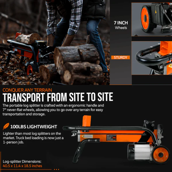 Our lightweight log splitter is built to be portable with a fast and easy setup for anywhere nature takes you; Complete with 7-inch Sturdy transport wheels, allowing for smooth maneuvering for easy transportation from site to site.